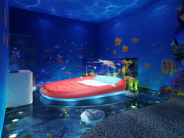 在芍药居店定情海主题房里,整个房间采用独有的海底世界设计,配以进口水床,房间地面更是创新的采用钢化玻璃以及鹅卵石设计,将真实的水上世界为您呈现,在浪漫纯净的海底世界中和TA一起迎接清晨的第一缕阳光,让您真实的感受到海底世界的浪漫风情!