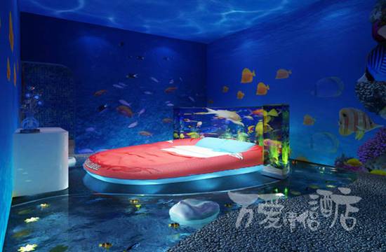 淡蓝色有一种深邃,遥远,寒冷,忧郁的感觉,却又温柔、宁静、明亮, 是智慧的象征。大鱼缸铸就浪漫鸳鸯不羡仙,相拥在这鱼缸正中的水床上,看着旁边的鱼儿四处游动,完全一幅水下仙境样子。